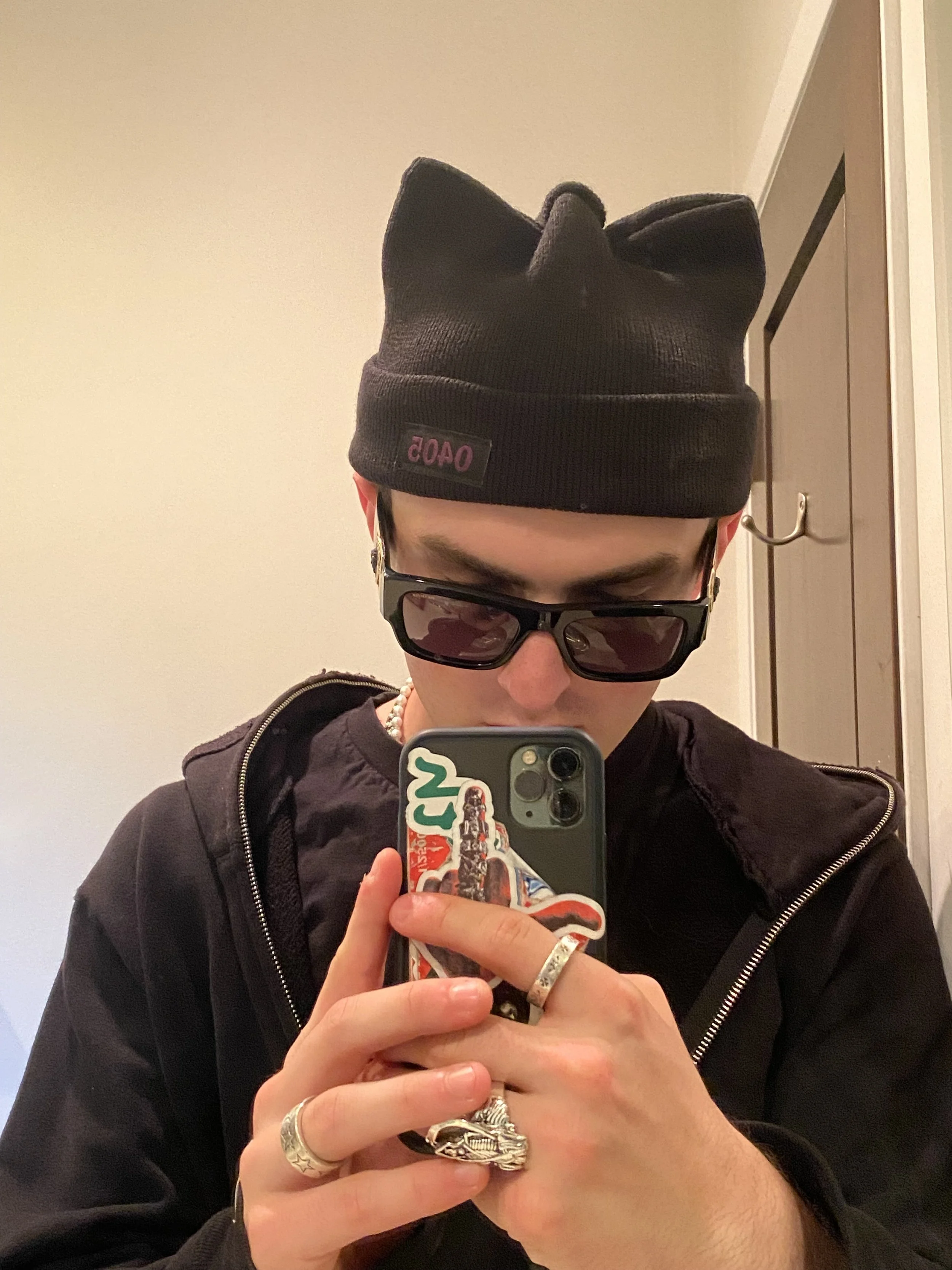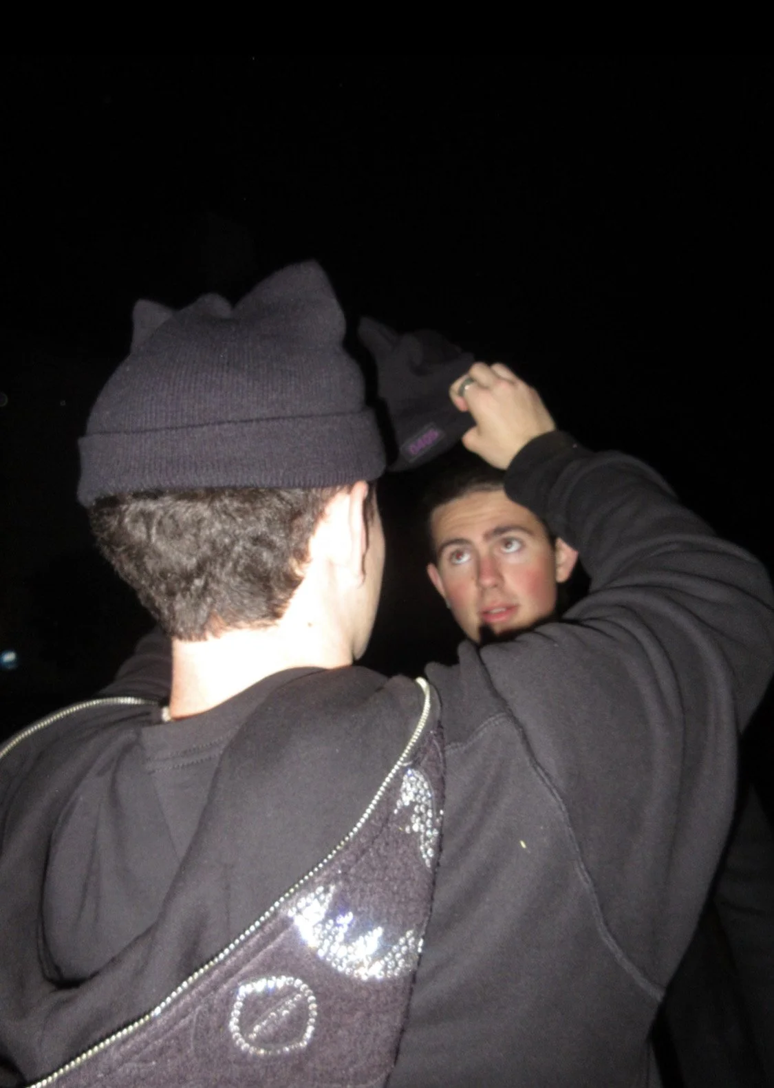 A hand knitted, hand spun collection of beanies inspired by my love of cats. I’ve always wanted one of those hats with cat ears, but didn’t like the way the ears were always attached rather than implemented into the garment itself. So, I created a pattern in which the ears were incoporated into the construction of the silhoutte, meaning this hat is actually made of only one piece of knit fabric, attatched is a rubber stamp sewn into the front reading “0405”, which is my birthday, April 5th