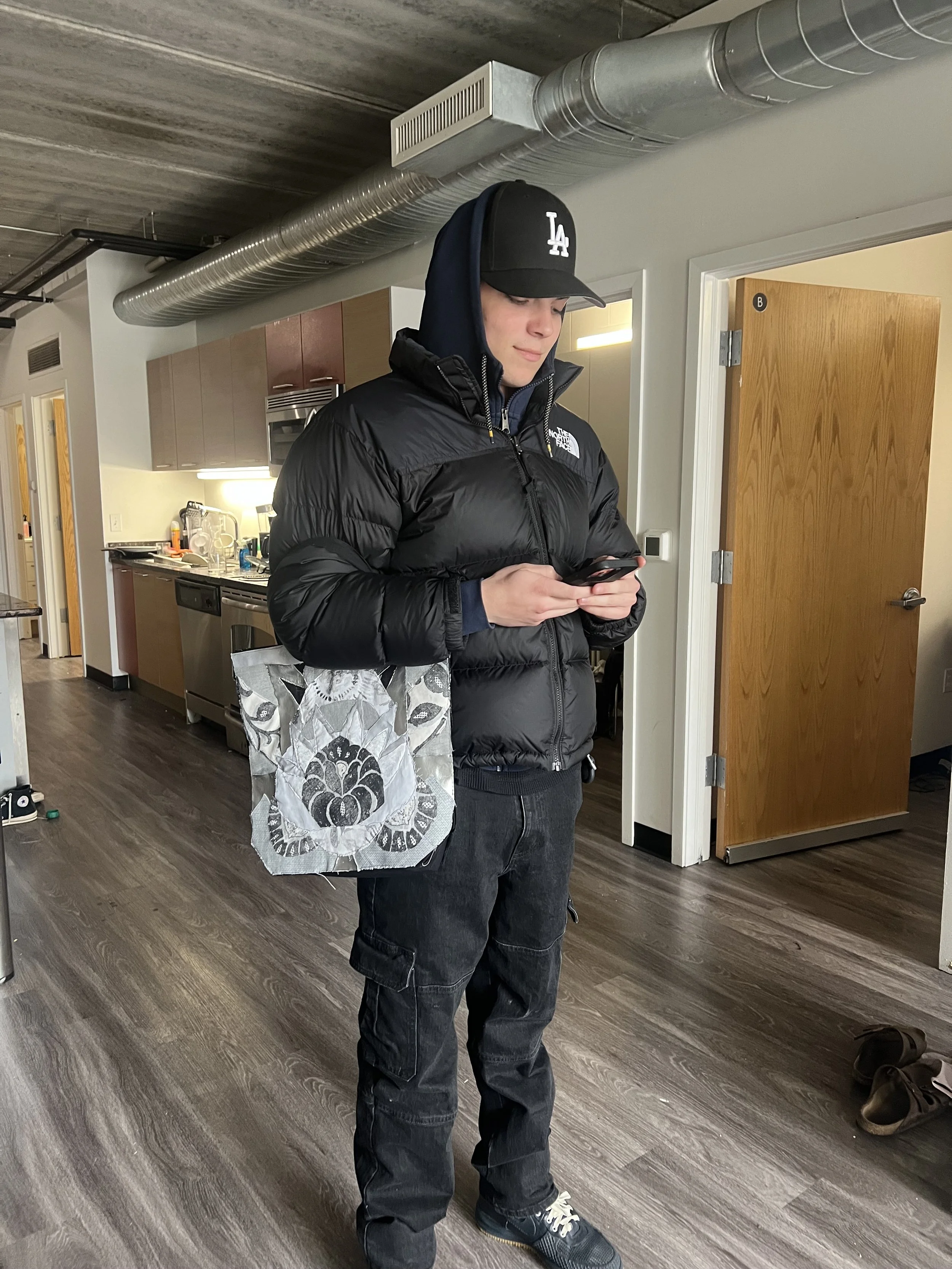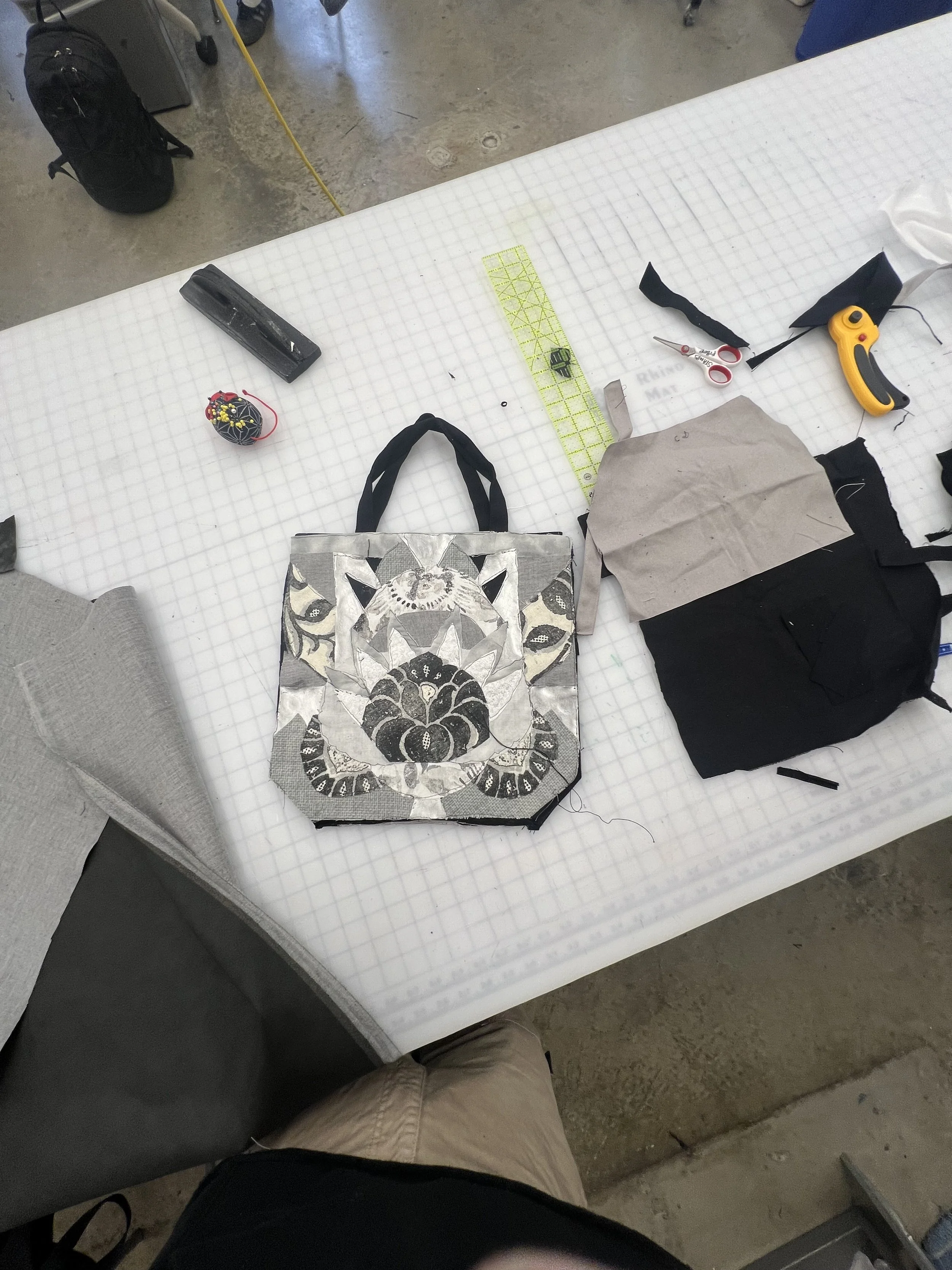 A custom over the shoulder tote with a applique collage pattern featuring 47 lines of symmetry and made of 10 different fabrics including faux leather, canvas, denim and more. The design is inspired by my childhood, featuring motifs from different aspects of my upbringing, including soccer, russian stacking dolls and palmtrees.