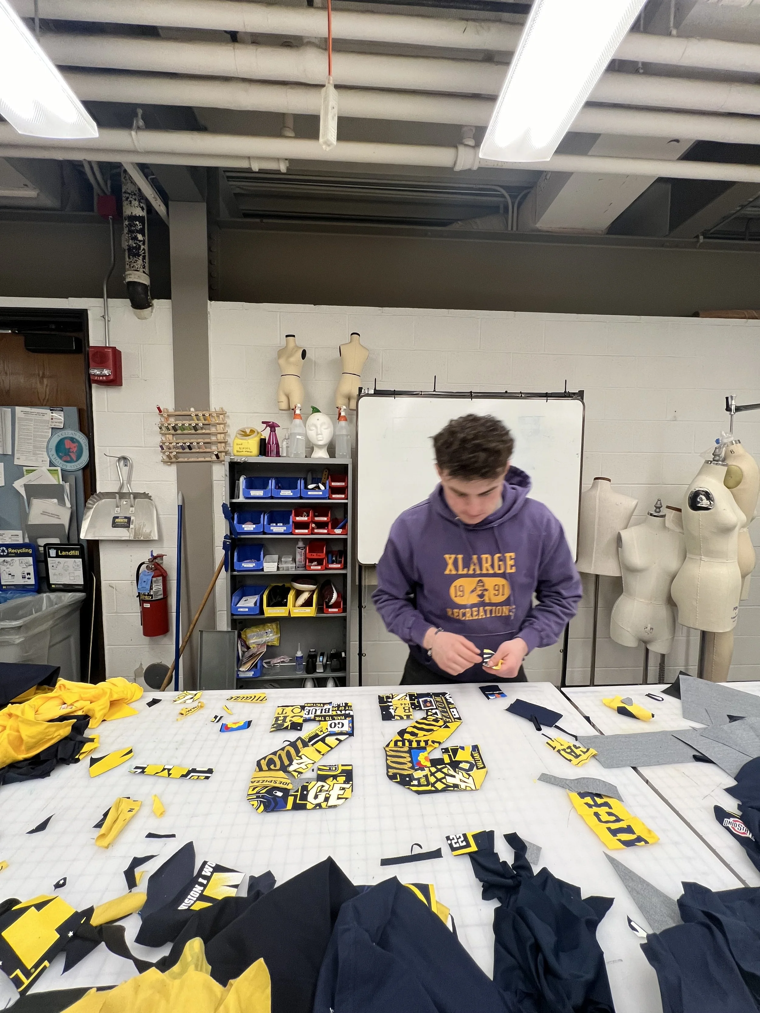 With only a weeks notice, I cut and sewed two 16 oz, garment dyed cotton fleece hoodies and assembled collage applique out of thrifted UMich apparel into the shape of a 2, the number both players wore on the field, each with layered with different motifs unique to each player.